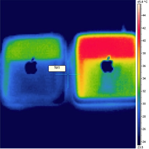 For example, the bottom of the device has a rubber cover on it. If you remove the cover, the panel actually has holes on the bottom and larger holes around the sides which would allow a lot more air into the device. It looks like Apple suffocates the device by not allowing enough air flow.