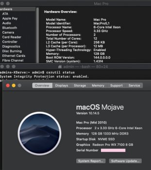 How did you go about installing mojave? Im just going through the process now and it wont let me update via the app store and im still running el capitan, i have installed mojave on another ssd via my MP but when i put it in the xserve i cant get it to boot. My xserve and MP are running the same gpus and firmware so i don’t understand why it wont work.I upgraded my xserve to 3.3Ghz 12 Core via 5,1 using multiple Bios versions - latest 144.0.0.0. One thing annoying, the additional memory slots can't be used. 128GB max in Mac OS. But great booting with NVMe, USB-C, and even MXM GPU. Geekbench shows comparable and faster speed than 12 core cMP.