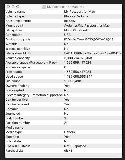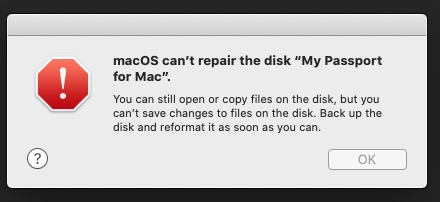 I've started getting this warning when I boot up my Imac (first screenshot). Second screenshot is current info about the "My Passport for Mac" external drive that I have been using for Time Machine backups for a number of years.