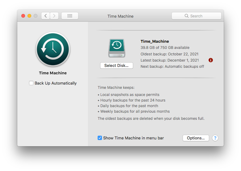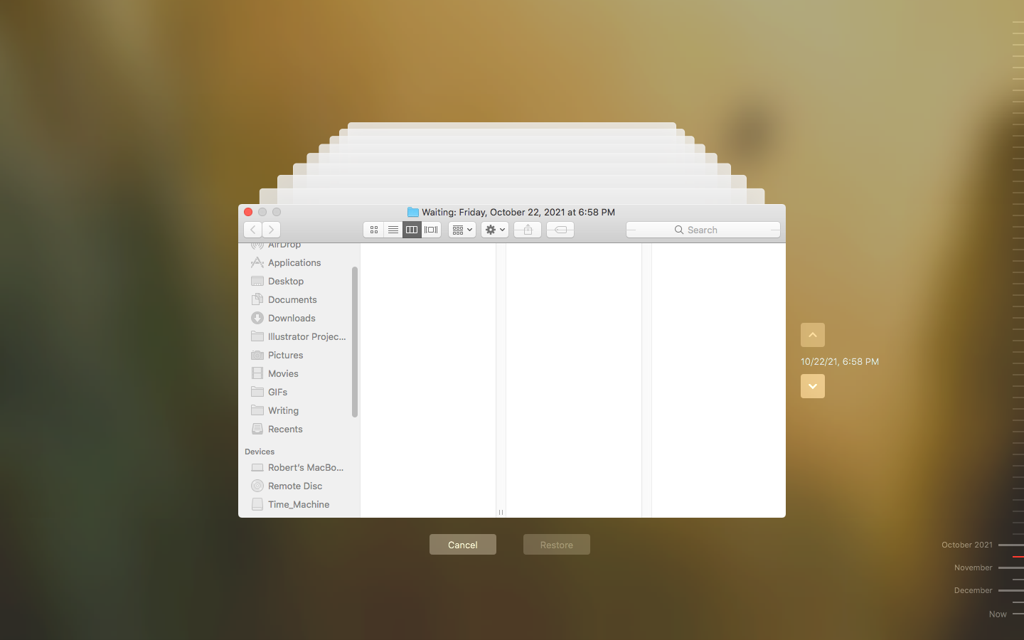 Had to ask this question because I've read somewhere around 3 dozen posts with similar problems but none are nailing what I'm dealing with. I started a new Time Machine set up with an external hard drive in October. Time Machine has worked just fine for me in the past, and I have only three backups: one in October, one in November, and one in December. I'm trying to restore a lost file that might be in the November backup or the October backup, but here lies the problem. I can enter Time Machine, I can see the December backup and restore those files just fine. However, when I scroll back to November or October, the Finder header says "Waiting" and never loads up my files. I've waited as long as an hour and a half after reading a couple threads where someone was having such an issue (but ultimately their problem was unrelated and the thread was 4 years old, so no solution for me).