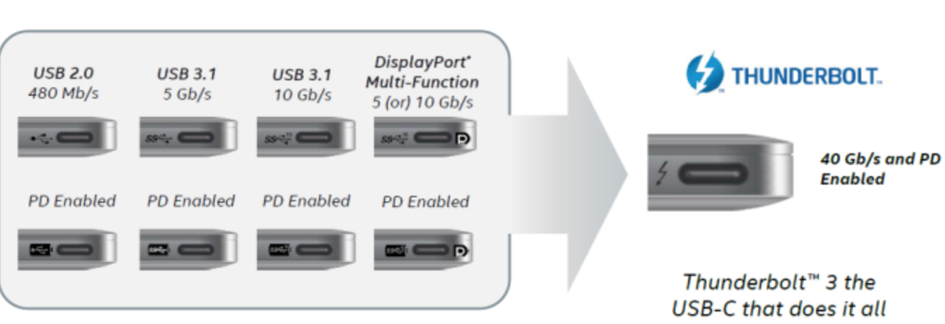 Thunderbolt 3 is a superset solution which includes USB 3.1 (10Gbps), and adds 40Gbps Thunderbolt and DisplayPort 1.2 from a single USB-C port. This enables any dock, display, or data device to connect to a Thunderbolt 3 port, fulfilling the promise of the USB-C connector. Now with a Thunderbolt 3 port, you can connect to any dock, device or display, including billions of USB devices.