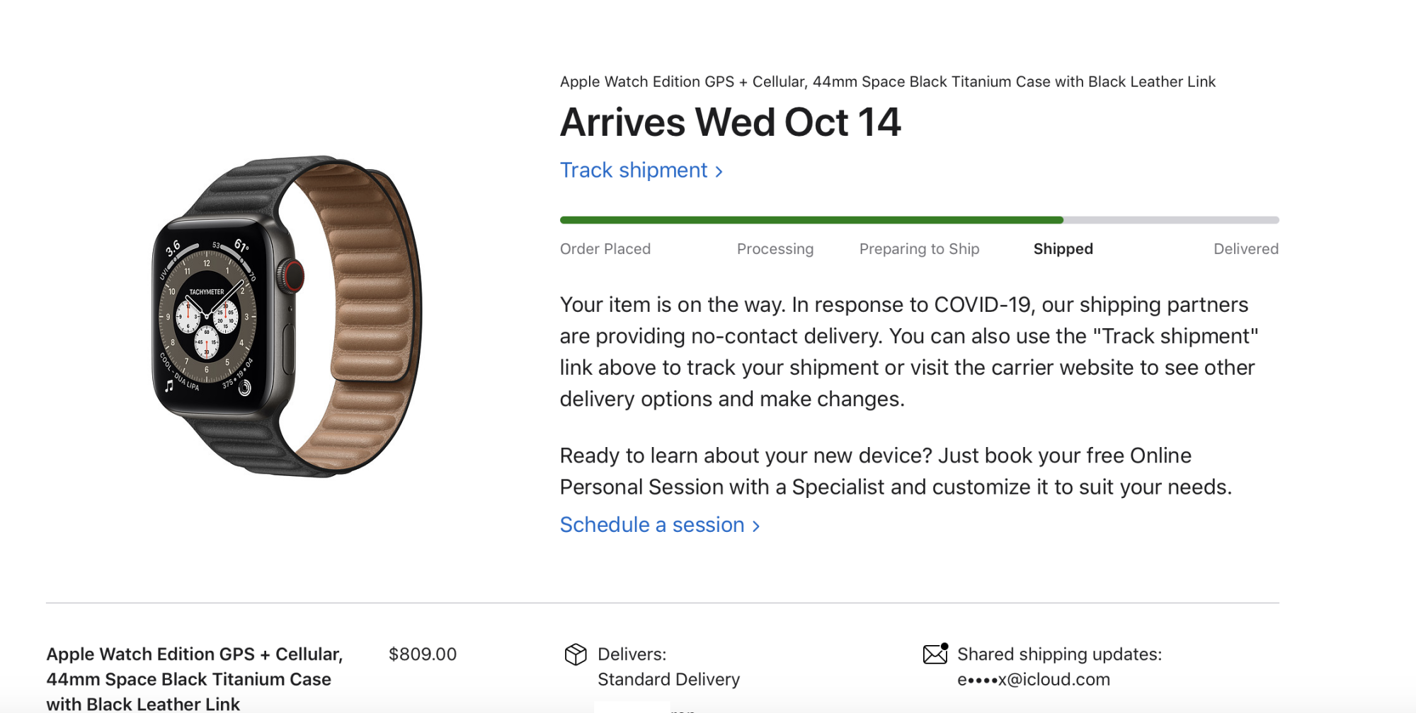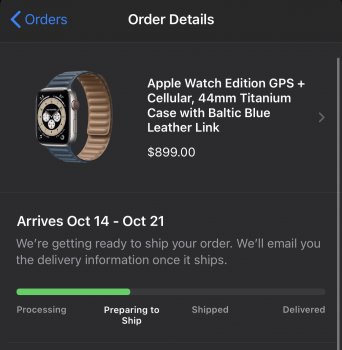 I order the same and it shows that it shipped, but UPS showing in with a Scheduled DeliveryJust ordered Titanium space black with the black leather link. Ship date also Oct 14 to 21st.![]()