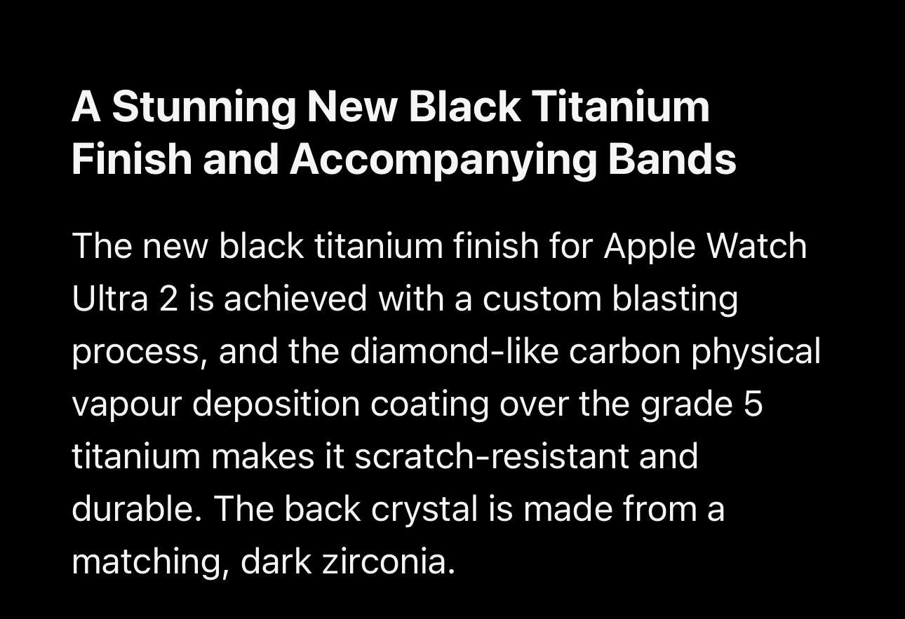 “Come 2024, the Ultra 2 is getting a tough-as-nails black titanium refresh with an accompanying Milanese loop. “The diamond-like carbon coating is even harder than the surface of natural titanium,” says Anderson. “If you scratch it on anything apart from maybe diamond, you're going end up with that object on your watch rather than scratching the coating off.”I would like to know because for me PVD=dealbreaker whereas DLC=take my money.My AppleWatch 6 Space Black Ti with DLC looks like new and I have used it while hiking, swimming, biking,...