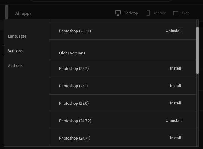 1. I've lost photoshop after recent re-subscription to Adobe Cloud (latest version not compatible). Before I go out and buy a new machine is there a way to install an earlier version of PS via adobe cloud?