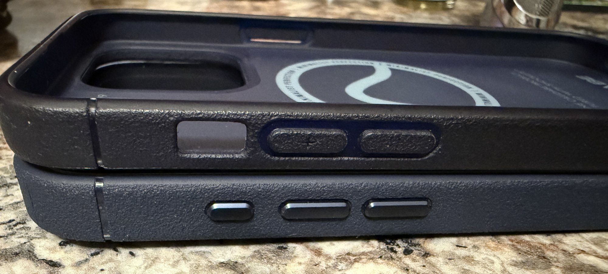 This pic is the 13 Pro Sheath lying atop the 16 Pro model, showing the difference in location (and also the metal vs. TPU buttons):