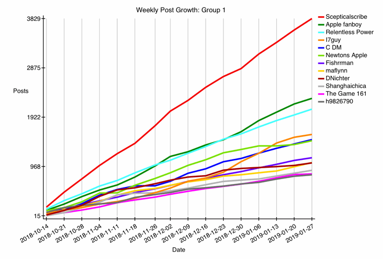 The main change in these graphs is the filter applied to the basic data. Last time, "Weekly Total Posts" was too flat to show much, and "Posts per Week" was so jagged it was hard to read. For this graph, we show the cumulative growth in post counts from the start of the weekly samples to the most recent sample. In effect, each member gets their own "starting count", and the graph only shows growth from week to week. The first point on each graph is the member's weekly post count on the left-most date.