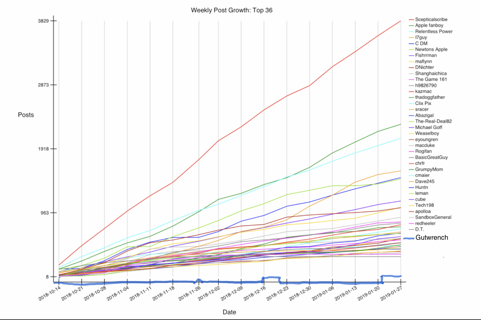 Notice the Y axis numbers in Group 1 vs. Group 2. Due to the prodigious post rates of the top few members, the top of the Y range is several times larger in Group 1 than it is in Group 2.