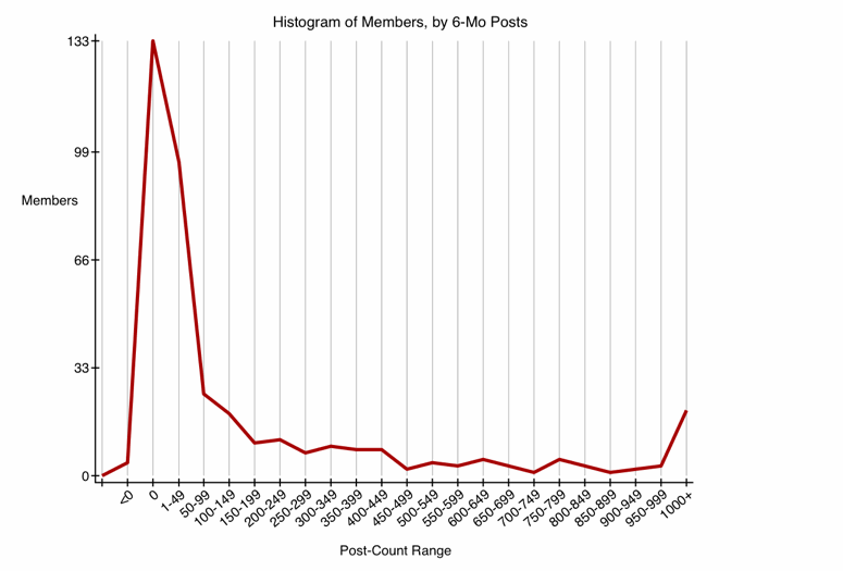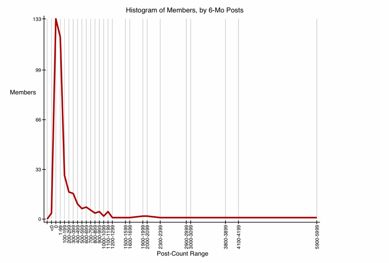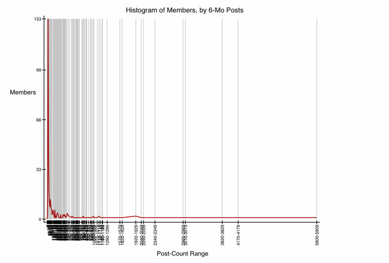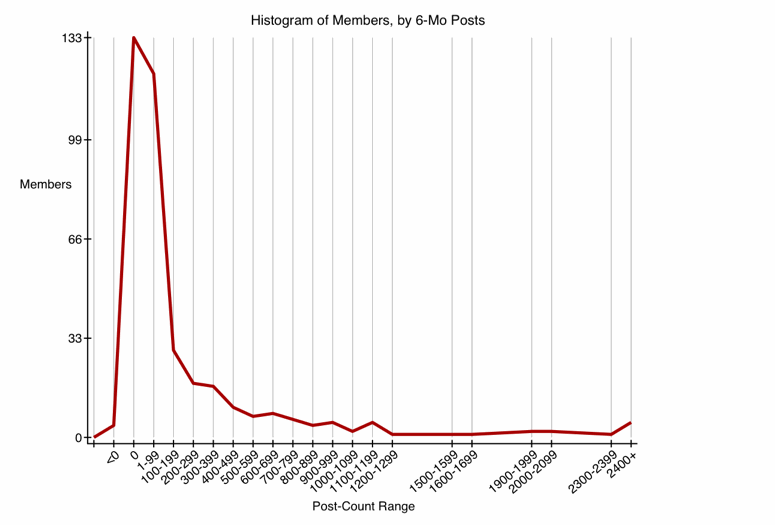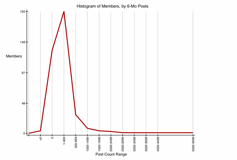 Previous graphs have looked at top posters, either by their total post-count, or by their prolificness in the prior 6-month interval. A histogram covers all the members, even those with few or no posts in the past 6 months. Technically, it covers all members with total post-counts of 4000 or more, because those are the only ones I collect data for.