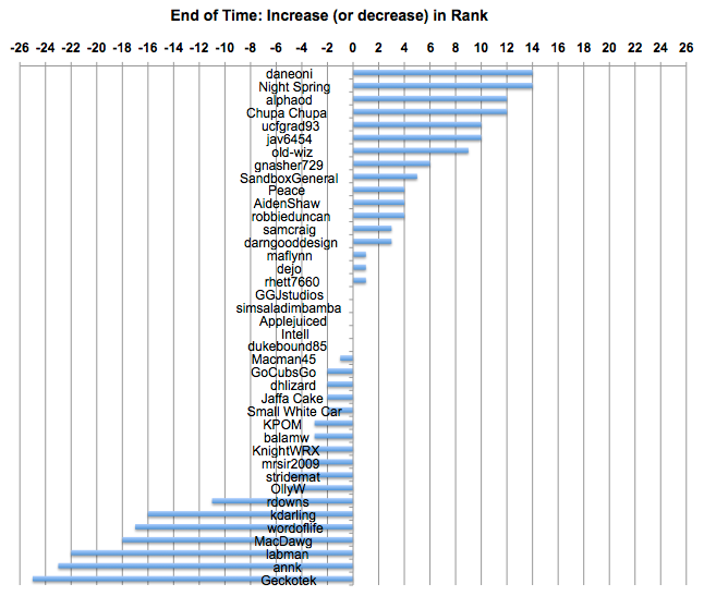 - Applejuiced stayed in 7th place rather than moving up past mkrishnan and Eidorian as I predicted last time.