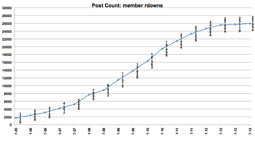 Anyone can look at anyone's profile page to get their current post count. That's what I do. But moderator or not, you can't look at somebody's post count from a given date in the past, so I rely on the history of post counts I've recorded over the years. So anyone could have gathered the data, but only I was foolish enough to actually do it!Is this done with numbers that only moderators have access to, or is this something us mere mortals could look at? I'd be interested in doing stats for myself as well.