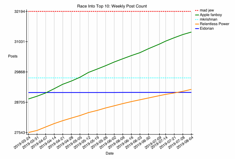 We also see that @Apple fanboy continues his push to surpass @mad jew, although the slight downward curve suggests a bit of slacking.