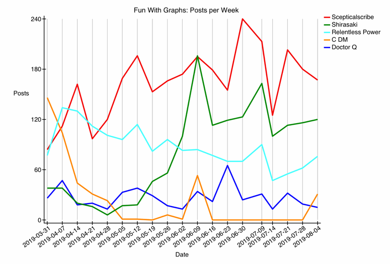 We can see an upward trend for @Scepticalscribe and @Shirasaki, a downward trend for @Relentless Power (but a promising rise near the end), an irregular but mostly flat trend for @Doctor Q, and a continuing roller-coaster for @C DM.