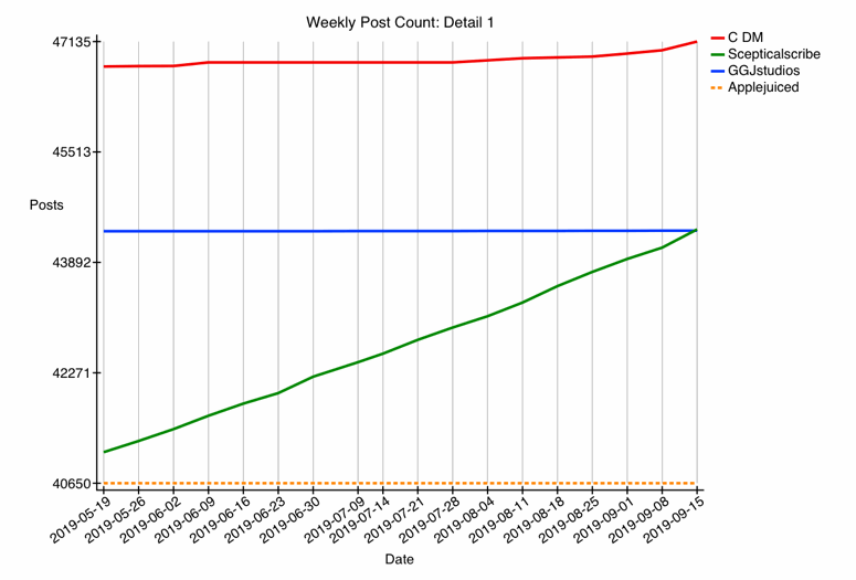 Code:Current Top 50 Cur 2-Mo Cur Delta Prev Delta 2-Mo Foll- Avg of one Rank on 2019-09-01 Posts Posts Rate Rate Rank Rank Likes owers post every ---- ---------------- ----- ----- ----- ------ ---- ----- ----- ----- ---------- 1 maflynn 63663 410 6.83 -3.05 1 0 711 25 3h 30.7m 2 C DM 46958 129 2.15 -4.57 2 0 92 22 11h 9.8m 3 GGJstudios 44356 5 0.08 -0.69 3 0 21 15 12d 0h 0.0m 4 Scepticalscribe 43943 1654 27.57 +0.94 4 0 900 40 0h 52.2m 5 Applejuiced 40650 --- --- --- 5 0 1 143 --- 6 Doctor Q 35947 143 2.38 -1.04 6 0 192 42 10h 4.2m 7 GoCubsGo 35742 1 0.02 +0.02 7 0 2 8 60d 0h 0.0m 8 mad jew 32194 --- --- --- 8 0 1 4 --- 9 Apple fanboy 31893 1057 17.62 -2.18 9 0 668 15 1h 21.7m 10 mkrishnan 29641 --- --- --- 10 0 1 11 --- 11 Relentless Power 29573 673 11.22 -4.23 12 +1 618 20 2h 8.4m 12 Eidorian 29081 --- --- -0.03 11 -1 0 63 --- 13 Weaselboy 28810 257 4.28 -0.22 13 0 282 81 5h 36.2m ====================== Current Top 50 Cur 2-Mo Cur Delta Prev Delta 2-Mo Foll- Avg of one Rank on 2019-09-08 Posts Posts Rate Rate Rank Rank Likes owers post every ---- ---------------- ----- ----- ----- ------ ---- ----- ----- ----- ---------- 1 maflynn 63686 433 6.46 -3.42 1 0 767 25 3h 42.8m 2 C DM 47008 179 2.67 -4.05 2 0 133 22 8h 59.0m 3 GGJstudios 44358 7 0.10 -0.67 3 0 21 15 9d 13h 42.9m 4 Scepticalscribe 44109 1820 27.16 +0.54 4 0 996 40 0h 53.0m 5 Applejuiced 40650 --- --- --- 5 0 1 143 --- 6 Doctor Q 35964 160 2.39 -1.03 6 0 201 42 10h 3.0m 7 GoCubsGo 35743 2 0.03 +0.03 7 0 2 8 33d 12h 0.0m 8 mad jew 32194 --- --- --- 8 0 1 4 --- 9 Apple fanboy 31987 1151 17.18 -2.62 9 0 732 15 1h 23.8m 10 Relentless Power 29666 766 11.43 -4.01 12 +2 719 20 2h 6.0m 11 mkrishnan 29641 --- --- --- 10 -1 1 11 --- 12 Eidorian 29081 --- --- -0.03 11 -1 0 63 --- 13 Weaselboy 28842 289 4.31 -0.19 13 0 322 81 5h 33.8m ====================== Current Top 50 Cur 2-Mo Cur Delta Prev Delta 2-Mo Foll- Avg of one Rank on 2019-09-15 Posts Posts Rate Rate Rank Rank Likes owers post every ---- ---------------- ----- ----- ----- ------ ---- ----- ----- ----- ---------- 1 maflynn 63719 466 6.30 -3.59 1 0 817 25 3h 48.7m 2 C DM 47135 306 4.14 -2.58 2 0 238 22 5h 48.2m 3 Scepticalscribe 44377 2088 28.22 +1.59 4 +1 1123 39 0h 51.0m 4 GGJstudios 44358 7 0.09 -0.68 3 -1 22 15 10d 13h 42.9m 5 Applejuiced 40650 --- --- --- 5 0 1 143 --- 6 Doctor Q 35977 173 2.34 -1.08 6 0 210 42 10h 16.0m 7 GoCubsGo 35743 2 0.03 +0.03 7 0 2 8 37d 0h 0.0m 8 Apple fanboy 32196 1360 18.38 -1.42 9 +1 879 15 1h 18.4m 9 mad jew 32194 --- --- --- 8 -1 1 4 --- 10 Relentless Power 29840 940 12.70 -2.74 12 +2 943 20 1h 53.4m 11 mkrishnan 29641 --- --- --- 10 -1 1 11 --- 12 Eidorian 29081 --- --- -0.03 11 -1 0 63 --- 13 Weaselboy 28893 340 4.59 +0.09 13 0 363 81 5h 13.4m