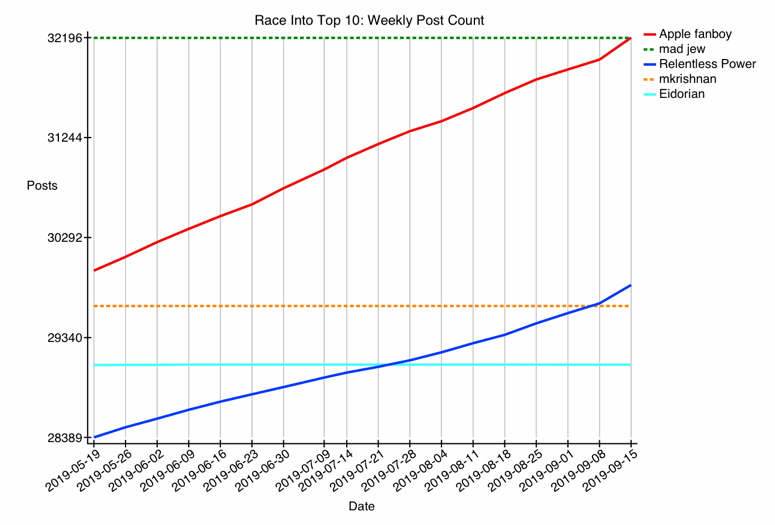 Finally, on 2019-09-15 we see two additional changes: @Apple fanboy surpasses @mad jew, and @Scepticalscribe moves past @GGJstudios into 3rd place.
