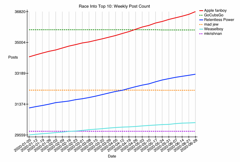 The middle change shows @Relentless Power surpassing @mad jew. The Jan 2020 projection for this event was made in Table 5, and was predicted to happen on 2020-Apr-03. It actually occurred a few weeks later, in the week of 2020-04-12. Checking the actual counts of 2020-04-12, Relentless Power had 32189 posts, and mad jew had 32199.