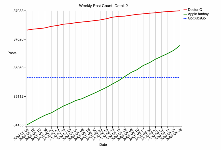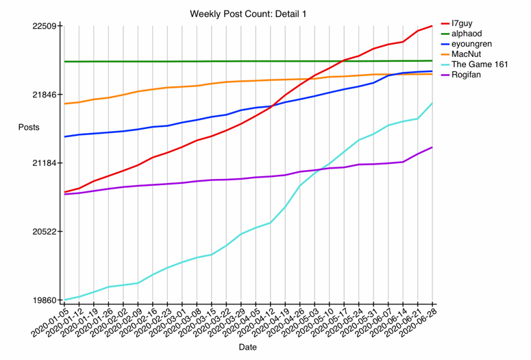 In the following, we look at the number of posts per week. This will make changes from week to week more obvious. For example, if someone makes exactly 20 posts every week, then their line in this graph would be flat at a level of 20. In the cumulative post-growth graph, their line would rise at a constant upward slope of 20 units per week. If they then drop to 18 posts per week, their posts-per-week line would drop by 2 units, a step that would easily be visible here, while their growth line would show only a slight flattening.