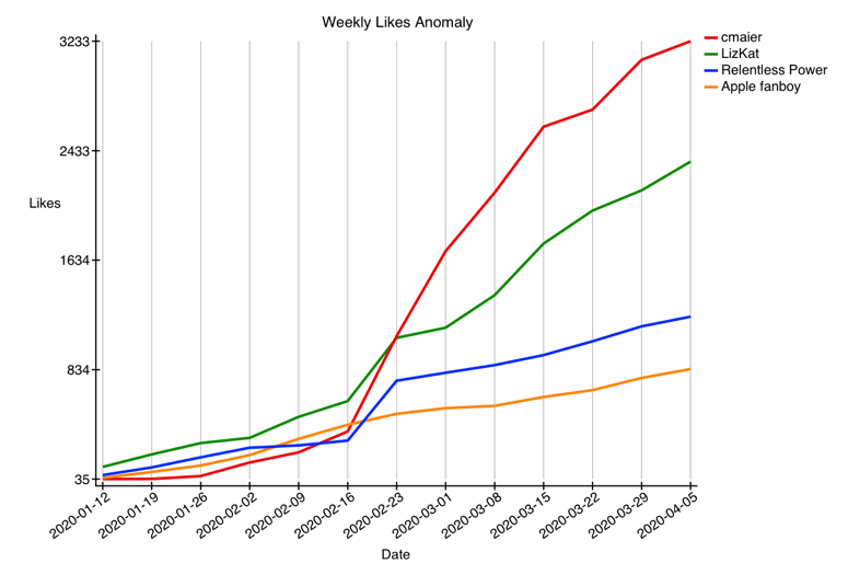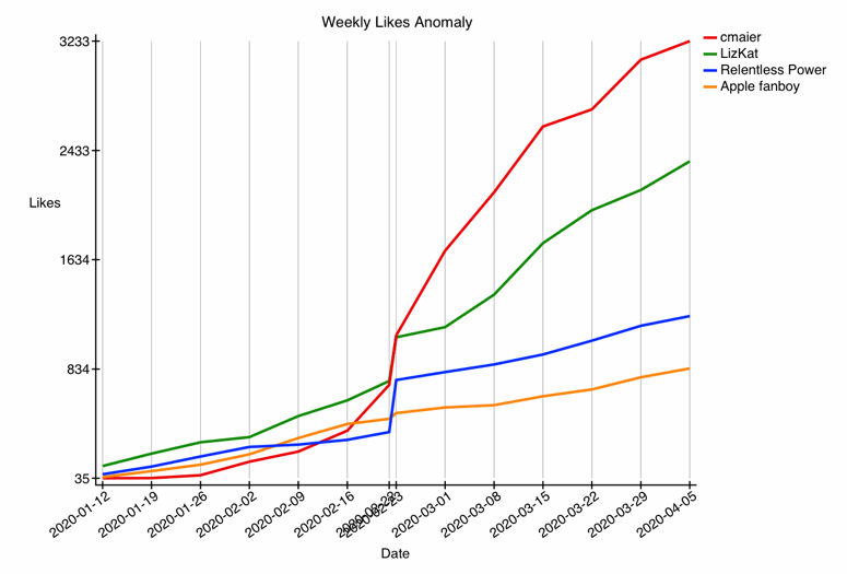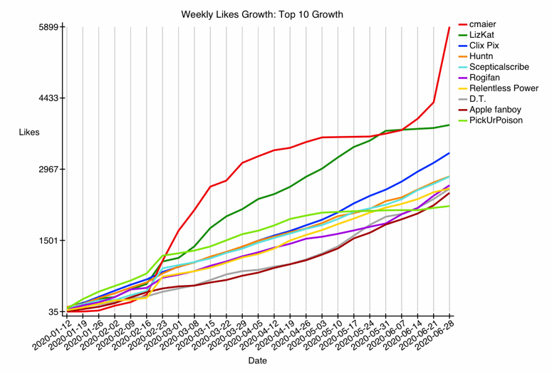 The 1st graph shows the Likes growth with the usual 1-week intervals. Here, @cmaier jumps up noticeably, then continues in a similar trajectory. Users @LizKat and @Relentless Power have a jump, but then continue with their previous growth rate. User @Apple fanboy looks to have no jump, just a normal weekly growth.