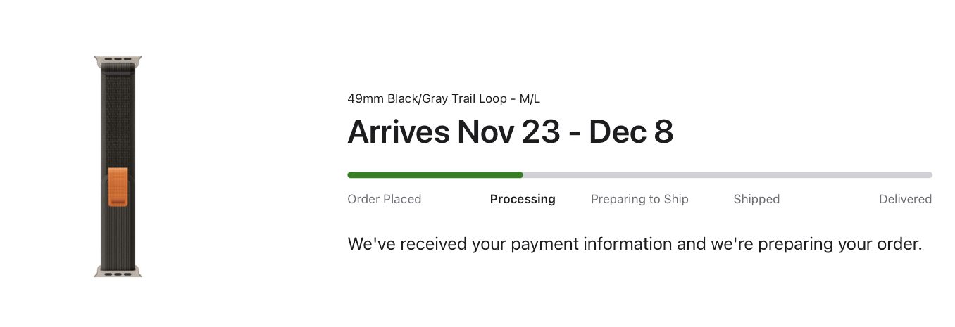 My Amazon Black Trail Loop is showing "By October 31." Also ordered on launch day.Not from Apple but my Amazon order I placed around launch day is showing a 10/27 delivery estimate. Blue TL.