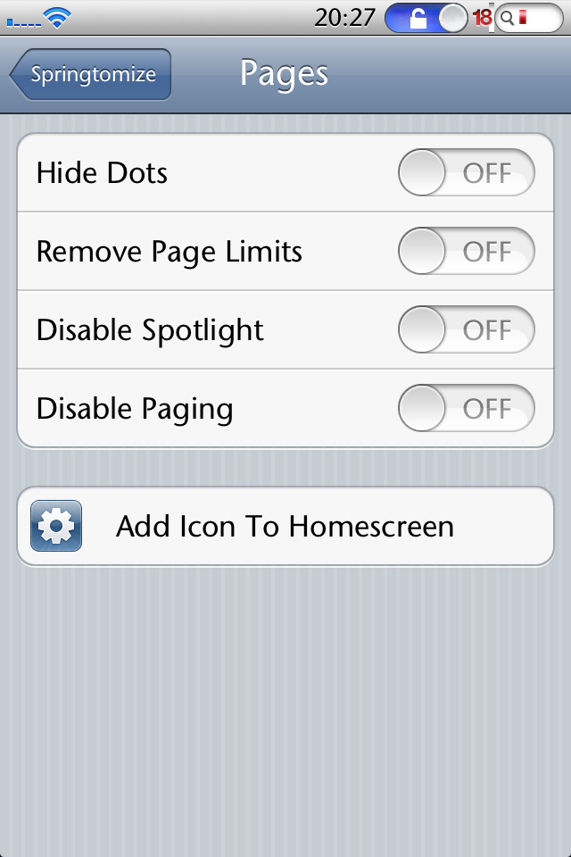 So there's no way I can have anything in springtomize on and Winterboard simultaneously? I have to keep nospot on, that's one of the main reasons I jailbroke. Is there anything else to disable spotlight search that won't interfere with transparent status bar? Also why was it working at first when springtomize was on?