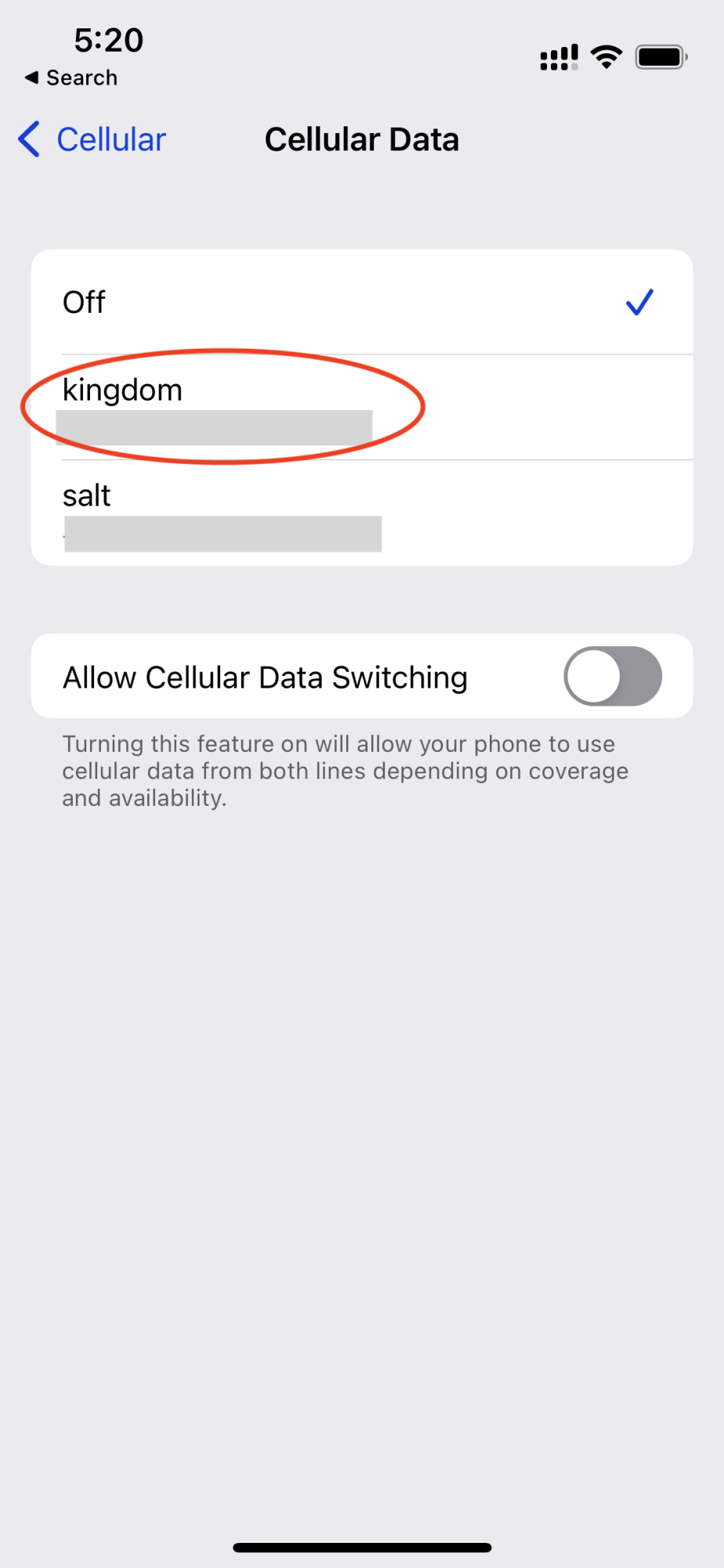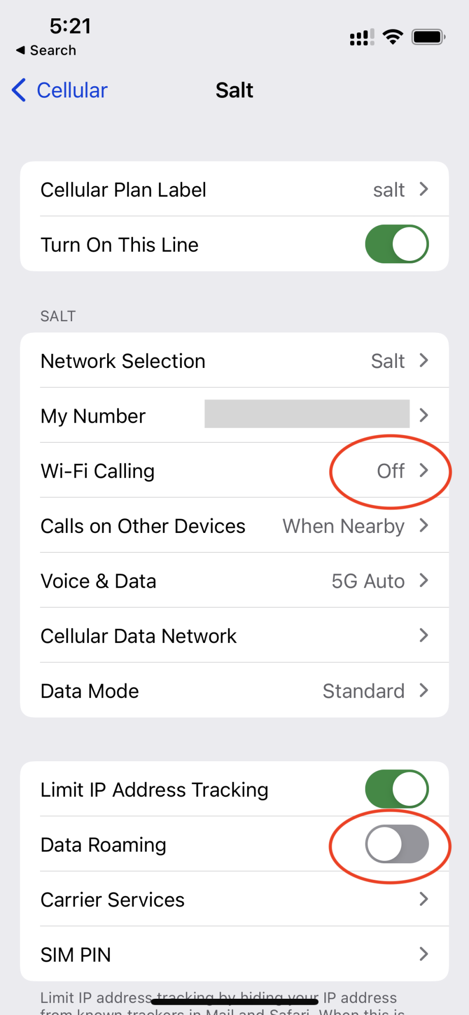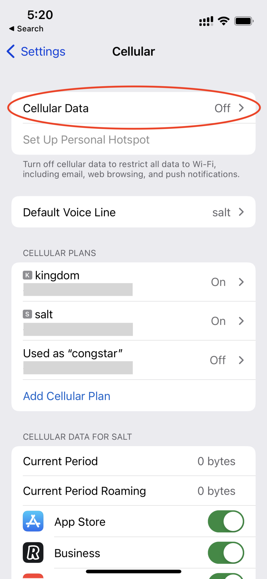Cellular Data is currently off - this is where you make the switch to the travel line once you are abroad.