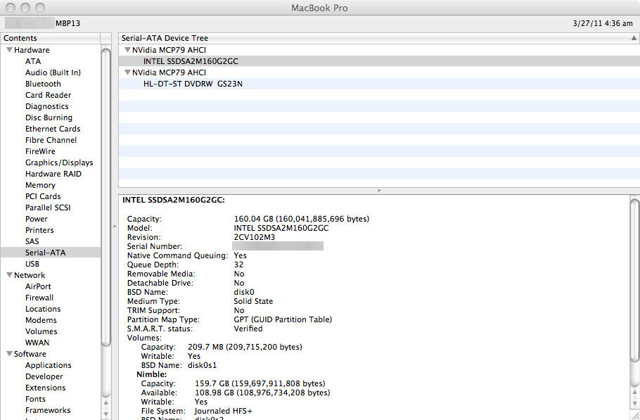Not sure if this next statement is indicative of a real change but the overall xbench disk benchmark went from 160 to ~175 about 1 hour post TRIM install. The original xbench result for that drive was just under 200. Will update in a day if this benchmark 'improves' any more.