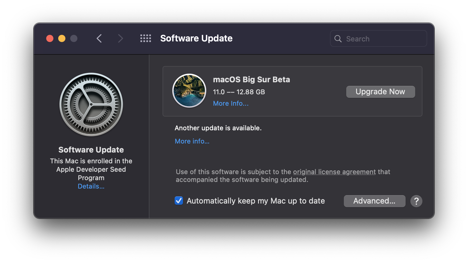 When updating to macOS Big Sur 11 Beta 3, you might be offered an unexpectedly large download rather than an incremental software update. (65753086) Workaround: Under the "Another update is available" text, click the "More info…" link. This will reveal the incremental update where you can click the Install Now button.