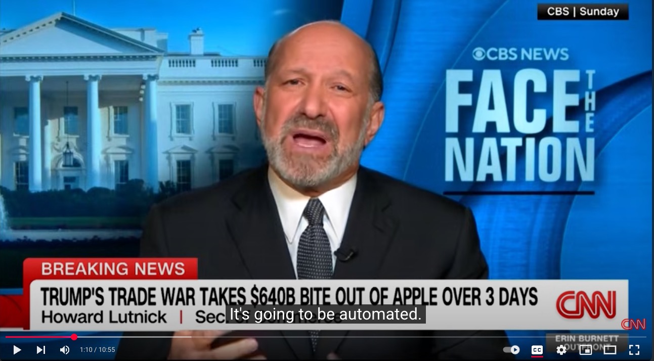 Edit: I added screenshot of Howard Lutnick saying that these job coming to America are going to be automated. So maybe not fully automated (yet) like I stated in my original text.