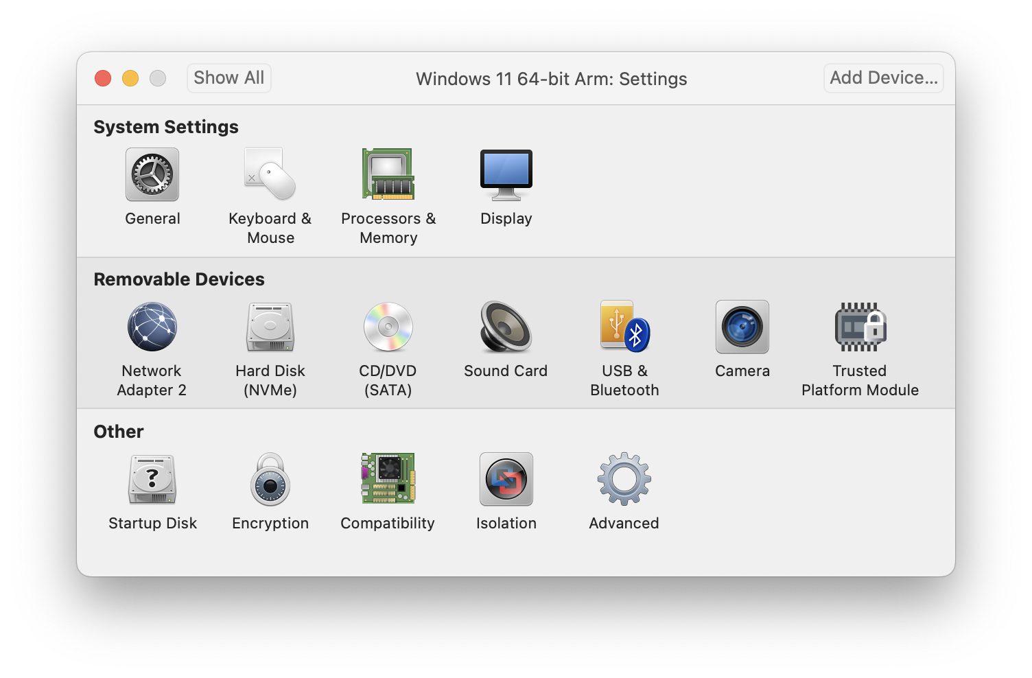 I'm trying to get sharing set up between my Windows 11 ARM VM and my Mac. Every FAQ I see says to go to the "Sharing" panel in the System Settings portion of the VM settings.