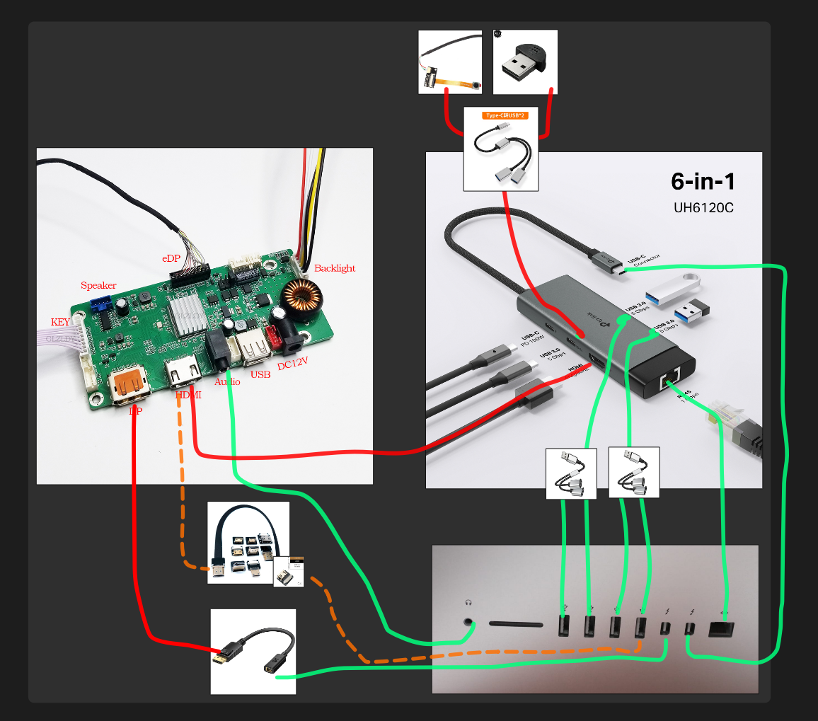 The plan is to put a hub inside and use all the port holes behind it except one of the TB ones which will become USB-C to conect to my laptop for image, sound, LAN, web cam etc.