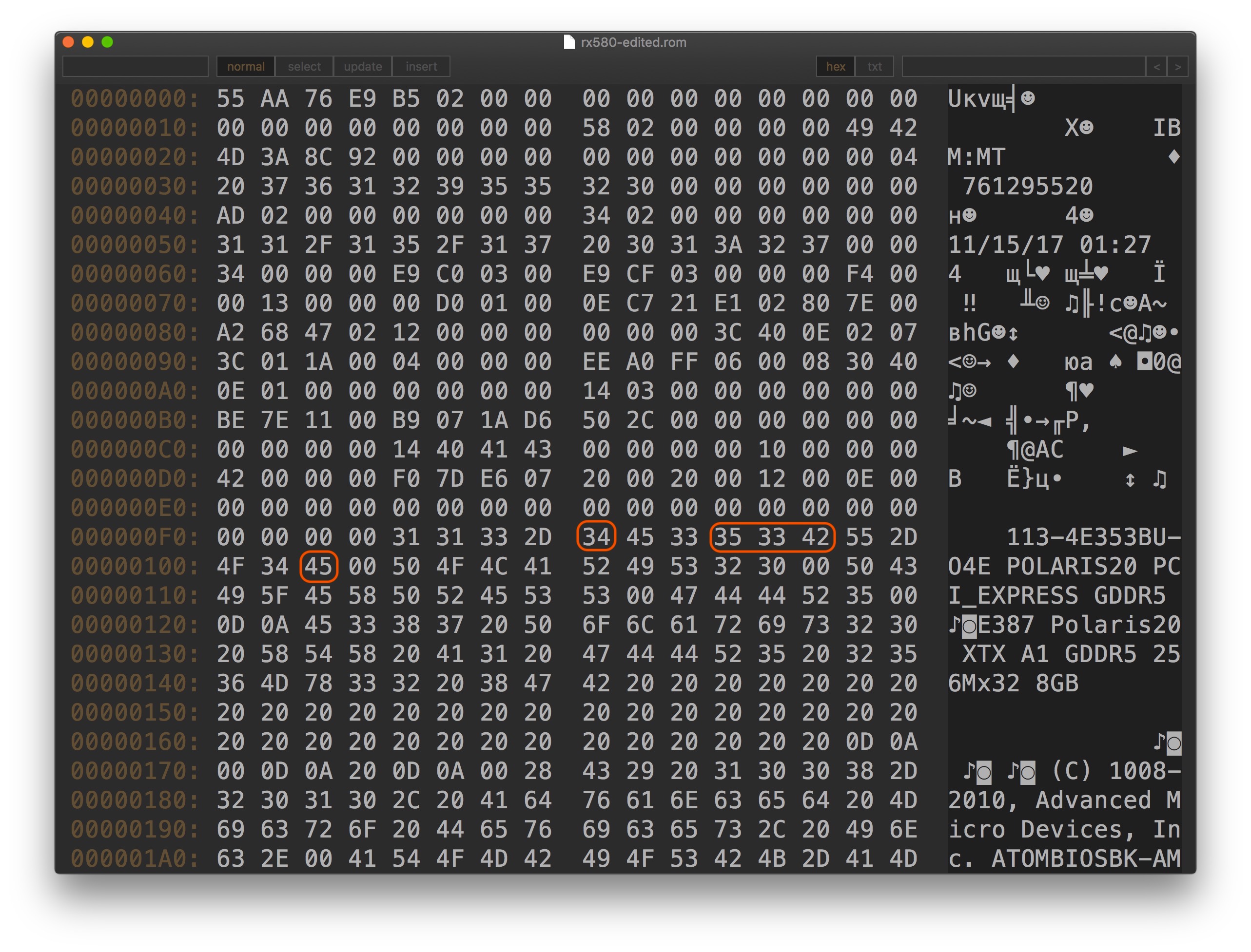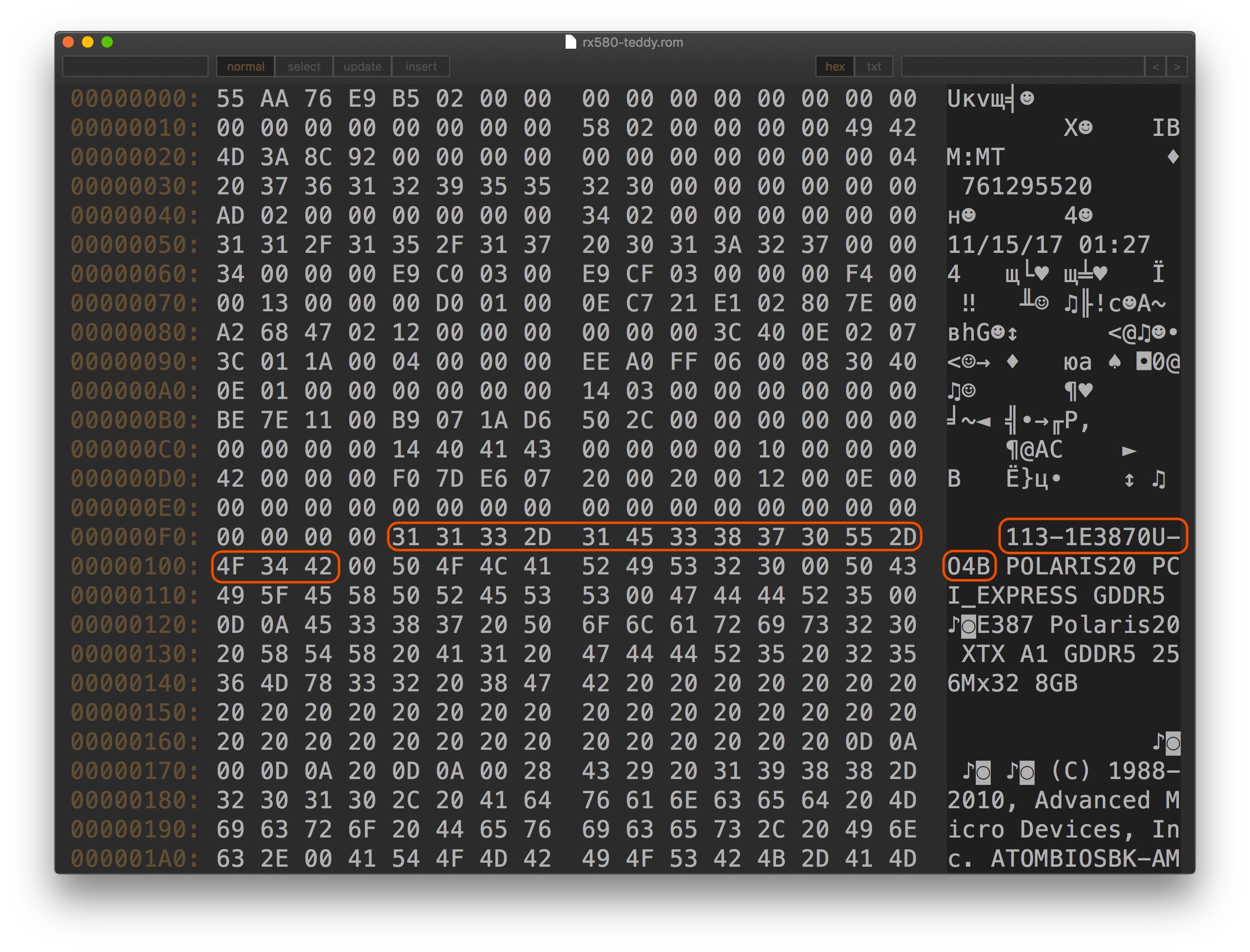 He sent me the original dumped ROM (by using ATIWinFlash in Windows. GPU-Z can also be used to dump the ROM), I open it (with HexMiner, but any hex editor can do the job), and obviously the part number is not the one that same as the Apple developer kit. (N.B. Before you do anything to the ROM image, backup your original dumped ROM at least twice, and only edit the copy of copy, NEVER edit the original ROM image backup. We should ALWAYS keep a MASTER BACKUP.)