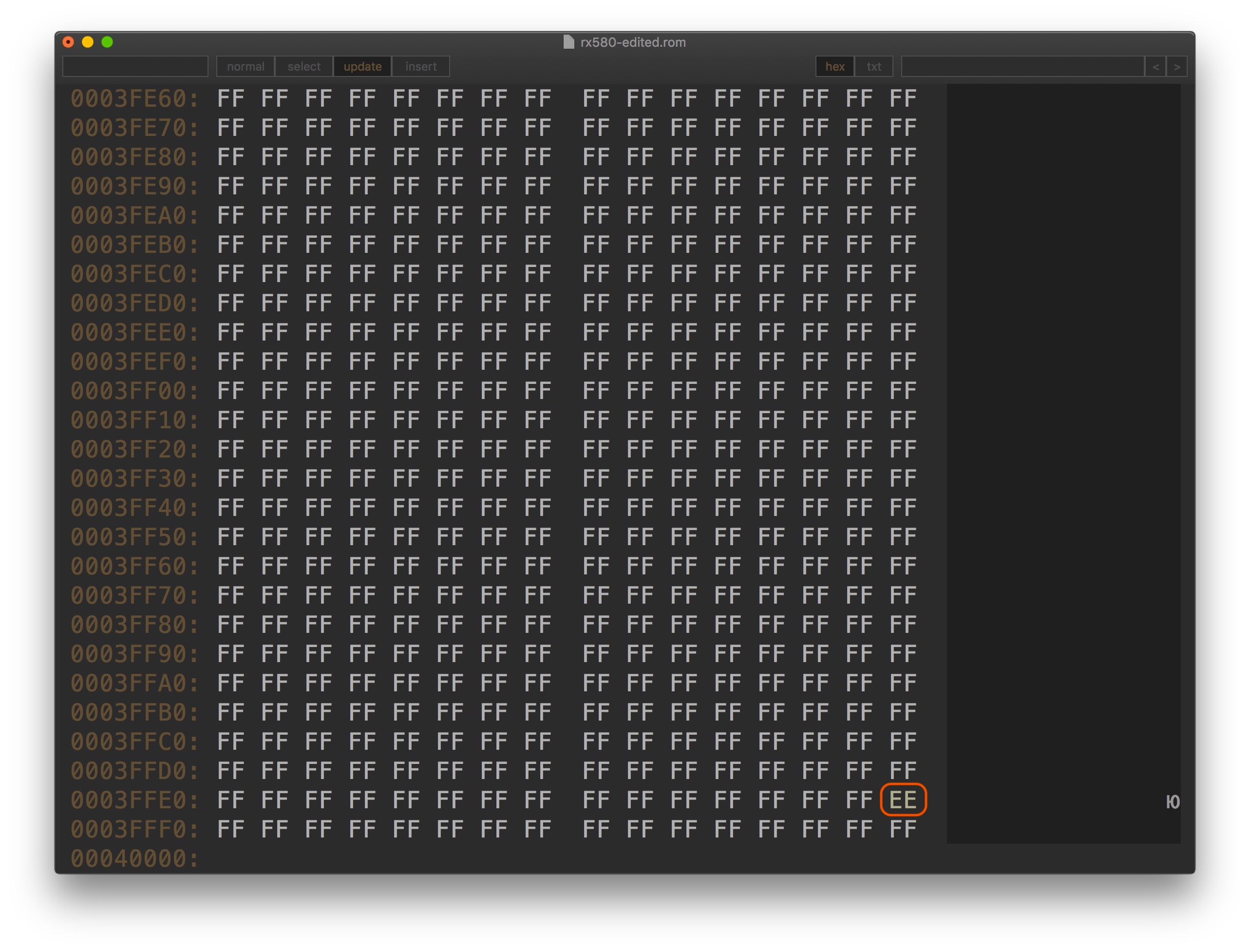That means, we need to find a useless byte and make it 11 smaller than the original number. A very standard way to do that is to find the very large piece of FF, which located at the end of the ROM, and change one of them from FF to EE (FF - 11 = EE from the Hex calculator). An example is like this.