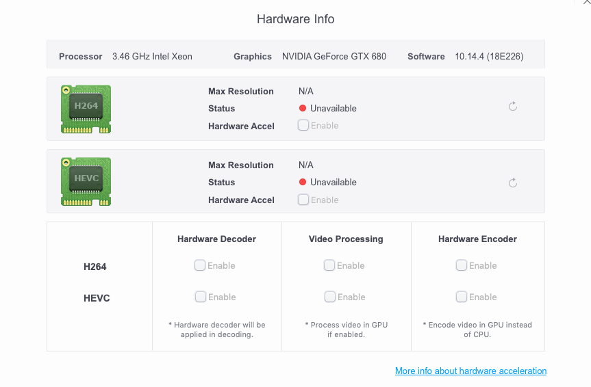 If anyone actually has paid for VideoProc, reach out to their developers. Show them this documentation (or additional) and ask if/when GPU support will be added in MP5,1. HEVC might not be possible due to CPUs in MP5,1 but H264 should be supported with NVIDIA GPUs from GeForce 8-series (GT 8800 Mac Edition) and forward. This is/was directly from NVIDIA press releases at the time.