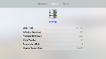 tvStorage allows you to check your used, free and total Storage Space on your new Apple TV as well as a few other tid bits.