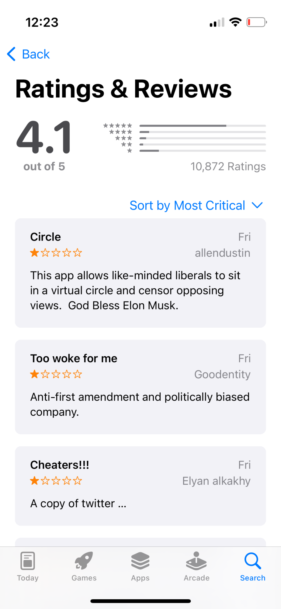 I think Facebook is as toxic as Twitter has become and would never use any Facebook product — but it’s entertaining to follow the drama as it plays out in discussion .. and even app reviews. This current snapshot of critical reviews shows that Twitter Bros are coming to the defense of their venerated CTO (Chief Toxic Officer). 😂