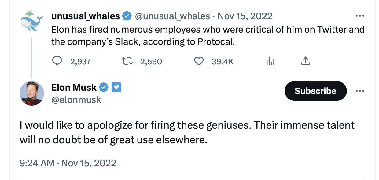 You understand the sequence of events.Let me see if I understand the sequence of events. Musk makes an outlandish offer to buy Twitter. Twitter calls the bluff and accepts. Musk gets cold feet and tries to wiggle out of the deal by claiming some made up issues with fake accounts (by the way, what has he done about bots and fake accounts now that he owns Twitter?). Musk is forced to buy Twitter or face the court system. Reluctantly buys the company and in a show of petty vindictiveness starts firing people all over the company. Things go down from there and continue going down. Claims some sort of freedom of expression crusade but it seems to be mostly allowing disinformation and hate go rampant. When you fire so many employees chances are some of them are going to end up creating a better version of your product. That is the computer industry ethos. Don't complain for a problem of your own creation. Way to tarnish your reputation after Tesla and SpaceX.