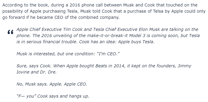 Tesla CEO Elon Musk reportedly once demanded that he be made Apple CEO in a brief discussion of a potential acquisition with Apple's current CEO, Tim Cook. The claim comes in a new book titled "Power Play: Tesla, Elon Musk and the Bet of the Century," as reviewed by The Los Angeles Times.www.macrumors.com