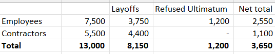11k is certainly a large number, but if you look at how many people work there (76,000) it represents only 15% of the workforce, where as Twitter effectively laid off 72% of their workforce (when you factor in both employees and contractors and that silly ultimatum).Also, Meta let go of 11,000 employees. That’s a lot of people.