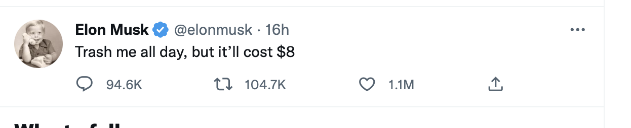 Bingo! Paying $8/month gets any user a blue tick. The point of the blue tick previously was to confirm that the person tweeting really is that person. If everyone pays $8/month for the blue tick how do you know who's the real person? Someone paid $8 then changed their profile picture to Elon Musk's. His account was banned. That won't happen to everyone who does it, though. Say someone pays $8 then changes their profile picture to Cher's. Will Cher have to report every single one of those accounts?I’m not following the computation for this one, unless we are referring that this verification is not really one?