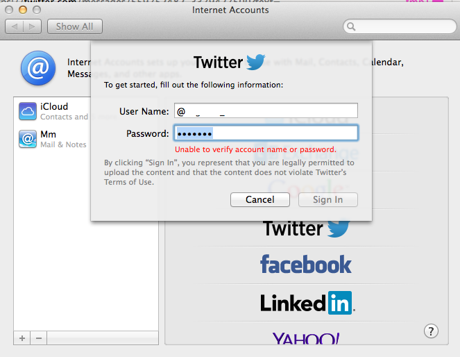 After googling the issue I figured that I just needed to add my Twitter account via System Preferences. However as I tried to make it I got what I posted on the screenshot below. I have double checked username and password and I have no problem logging in online on twitter.com however I don't see the way to add the account into the system and get the twitter thing back to my Notification Center.