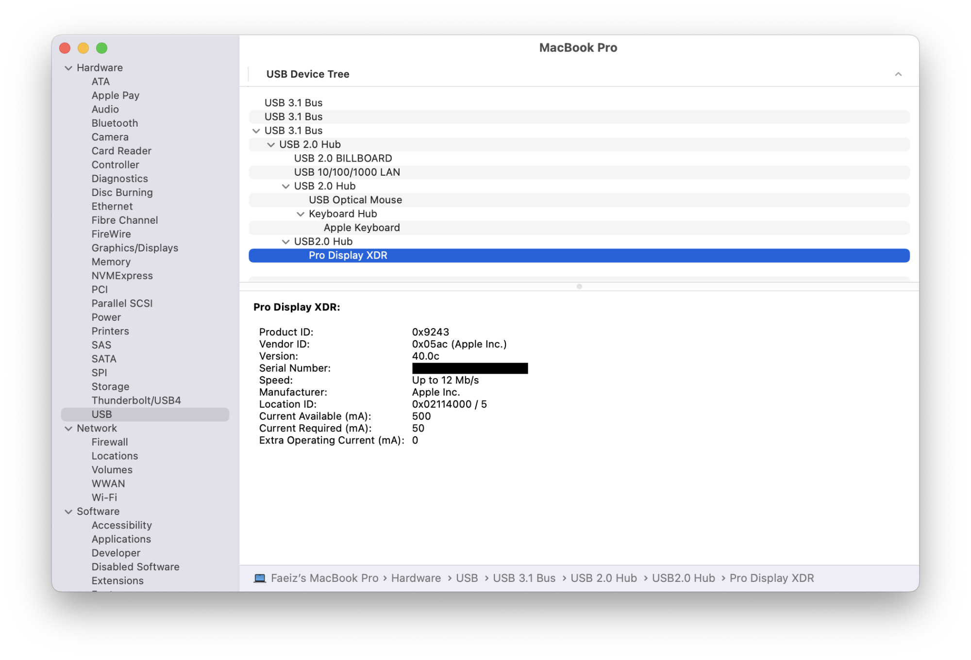 */com.apple.windowserver.displays*.plist files. It seems that the first item in the Configs array has a CurrentInfo dictionary that describes the framebuffer and a LinkDescription dictionary that describes the DisplayPort connection. Depth is probably the framebuffer color depth and BitDepth is probably the output color depth.I think you should have USB 2.0 support from the USB 3.0 hub of the XDR. Try connecting a mouse or keyboard to the XDR. If you connect a USB 3.0 Flash Drive, it should connect as USB 2.0.Actually I'm not using the USB hub on the XDR because I am using the Wacom Link Plus to send a DisplayPort signal to the XDR, so I don't believe it is even showing up in System Profiler...I think the highlighted entry here is the USB connection from the Wacom Link Plus used for controlling brightness on the XDR.