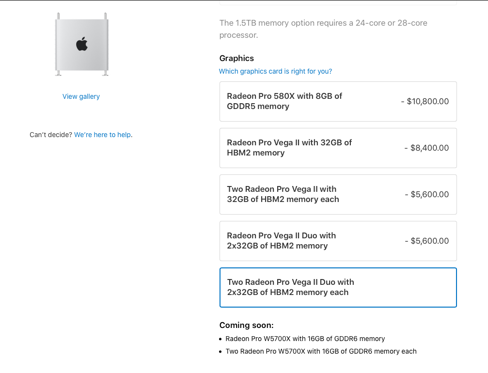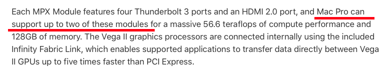 (***) The Vega II Duo support page isn't explicitly enumerating all possible configurations. It outlines a path to two XDR connections. IMHO, the path to a 3rd XDR is awkward (only a top port) and would run quite contrary to most users conceptualization of what to do ( i.e., hook a monitor to a port on the back of the system just like previous generations of systems. ). If the Duo's 2nd GPU to doing both top/front and back then there is a back option also (just not directly off the card edge).