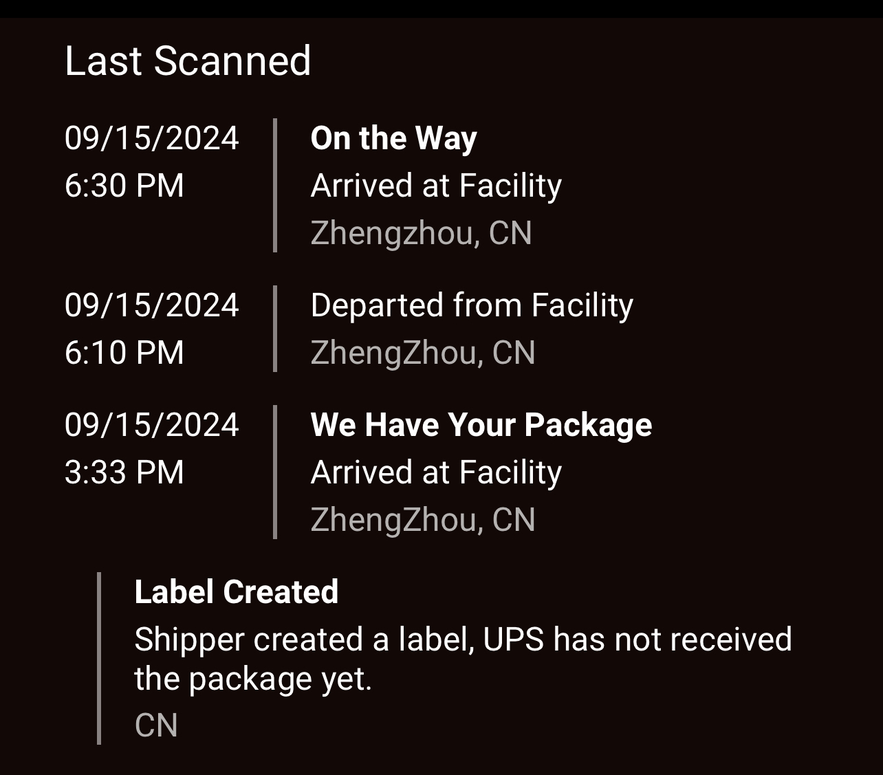 The next scan for Wave 2 should be around tomorrow afternoon/early evening showing Departure from ZZ approximately 4:30 AM 9/17 & then Arrival in Incheon, KR around 7:30 AM (3 hours later). I'm taking this from my scans last year and I'm assuming the flights will be pretty similar considering the scans so far are pretty close to last year's times.All phone are chilling at Zhengzhou, CN. Most likely at the airport for the next day or 2. If it says the 20th you should be good to go. Tracking eventually will show up on the UPS My Choice page...