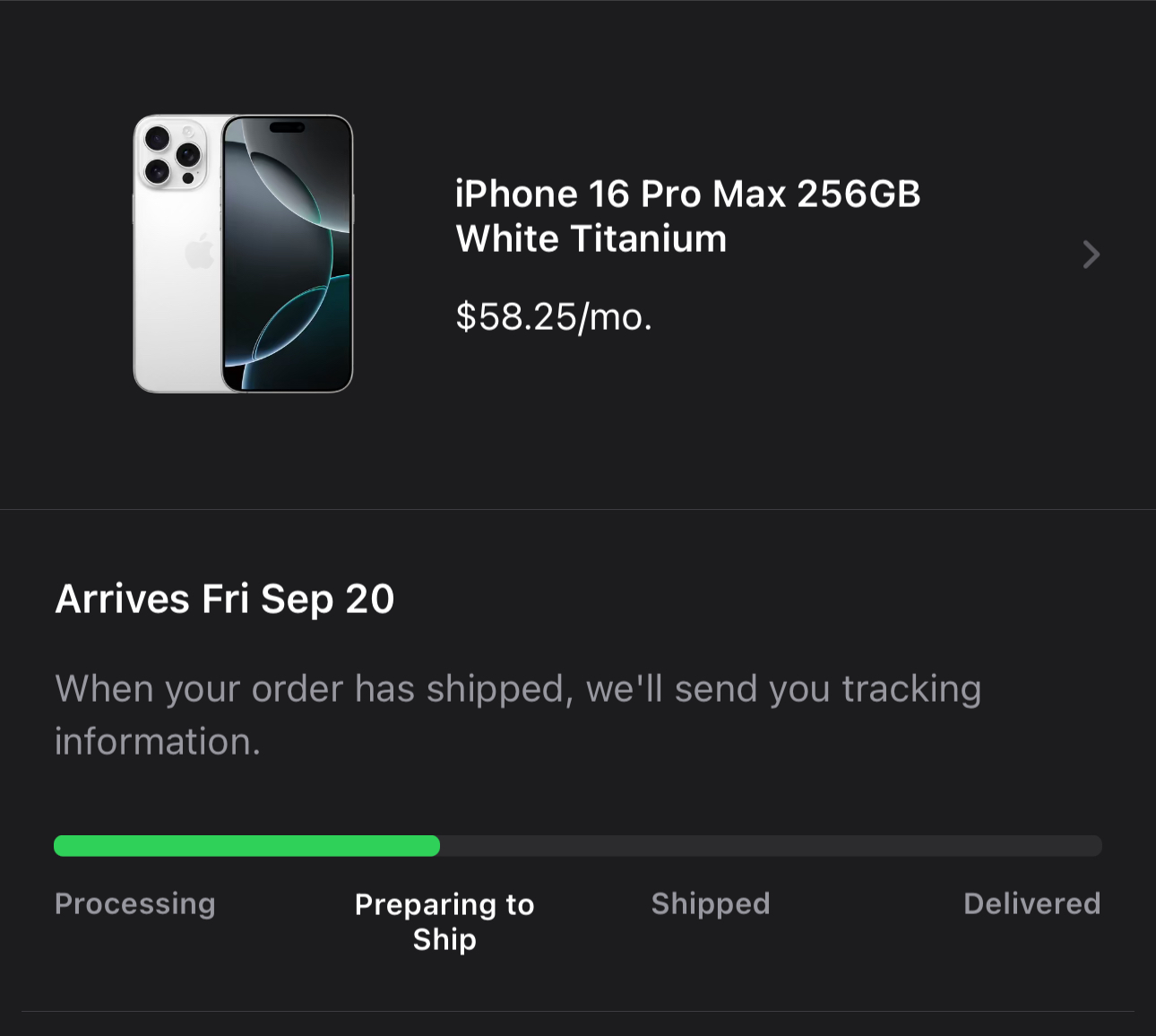 Same bro, I got no updates even thou it’s still saying 20th deliverySame here. Longtime UPS MyChoice member and I have no inbound shipments listed there….I have a 16P and 16PM on order for Sep 20 delivery.