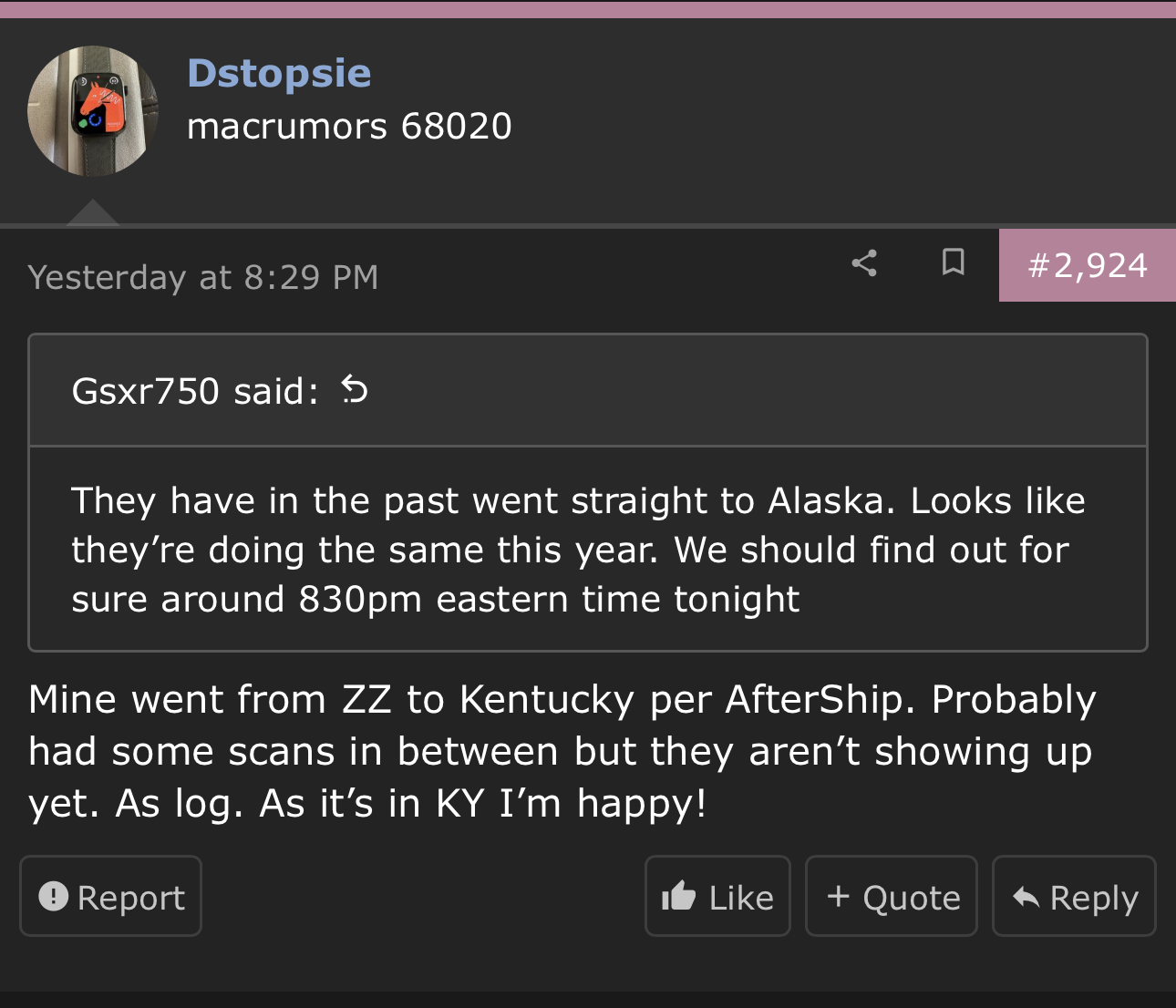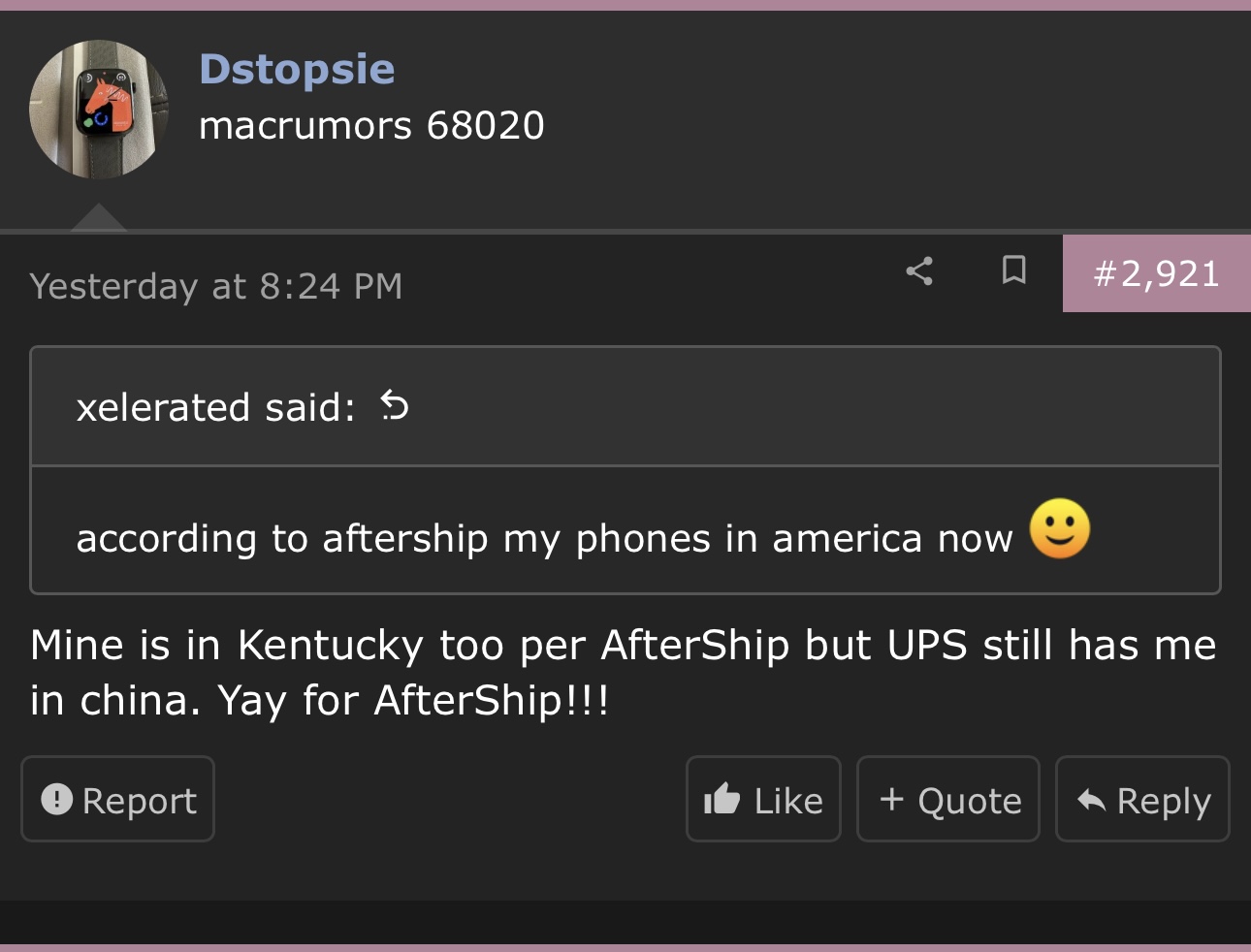 😂 being told you are wrong, because you are in fact wrong, doesn’t make anyone a bully dude. See the problem with your misinformation is then other people are going to see the same thing in aftership and think because they have that customs scan that their in Kentucky too when in fact their not. No one is “bullying” you. Everyone is just trying to inform you about what’s really going on. And I have been doing this for 14 years, every single year, since the iPhone 4 released. I was on this site when flight tracking started. And you didn’t just say you had no new scans since Saturday. You claimed your phone was in Kentucky. We simply were just informing you that you are incorrect.Come on please you really gonna pull the “we have been doing this for years card”. I have been doing this for 17 years since the first iPhone was released. All I said is I have NO NEW SCANS SINCE SATURDAY. THAT WAS THE LAST SCAN. if you have been doing this for years, then you of all people should know that UPS ships these ahead and the scans aren’t updated. I simply made an observation that my phone says it’s awaiting customs clearance. Do you and everyone else really think your phones are still in ZZ waiting to depart, because based on my years of experience since Apple started shipping the iPhones because the first iPhone was bought in store , it is not. The same thing happened last year with my iPhone, no new scans including a departure scan and then boom , next thing I know it was in KY.