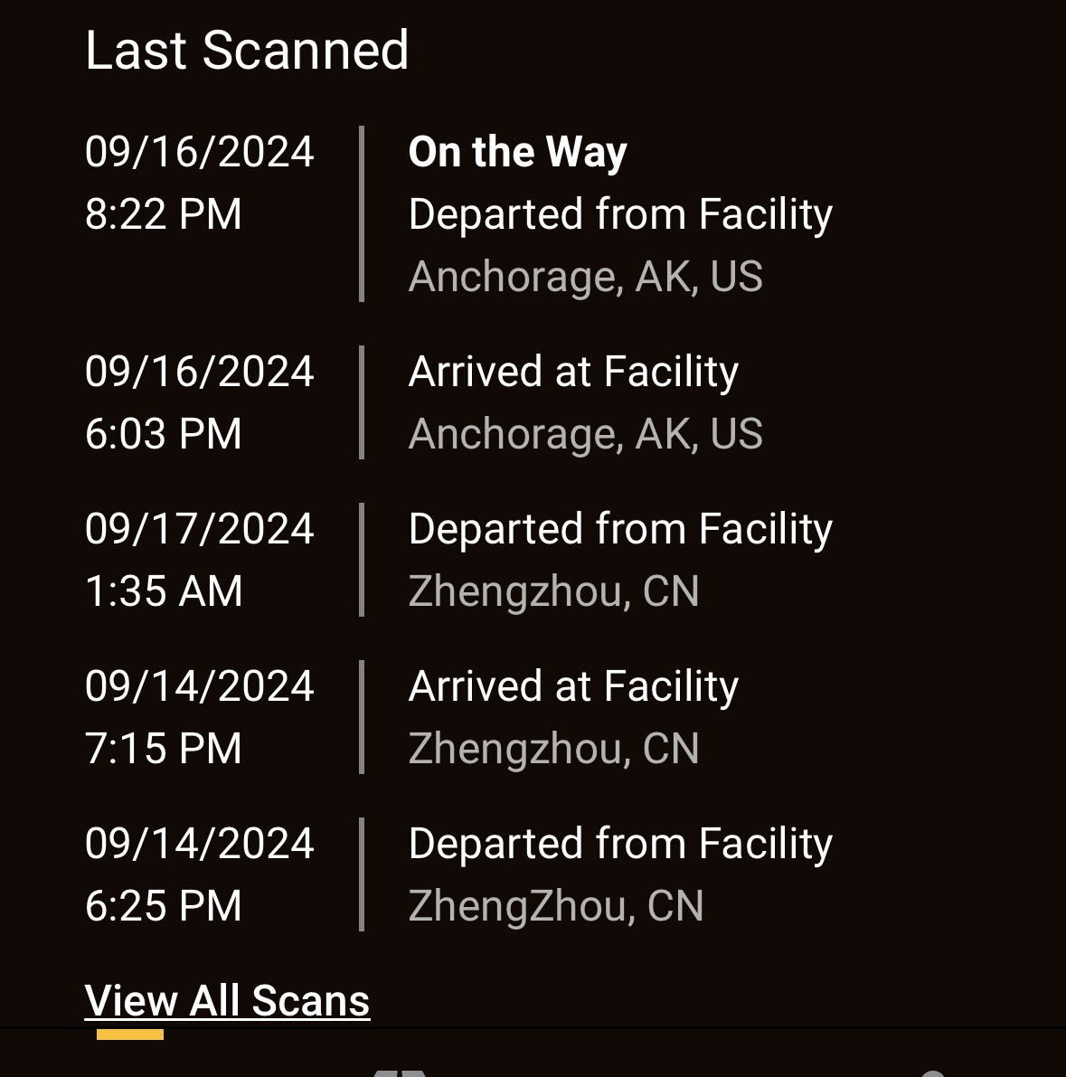 i too have that scan. my guess is it’s headed to louisville kentucky, muhammad ali international. there was an air cargo plane that took off around 8:11pm from anchorage headed to Louisville. i doubt we see another scan right away. the plane landed at 5:52am edt. since they won’t leave louisville until thursday, they’ll be in no rush to scan. maybe…Anyone else have an 8:22 PM EST departure time from Anchorage on 9/16? Any ideas where it is headed?