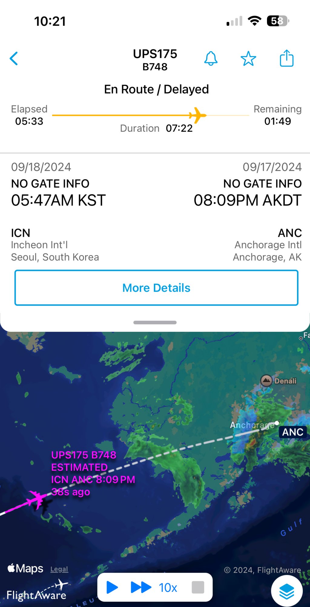 It will have to fly through some snow it looks like.As you probably know, the UPS plane going to Anchorage from Incheon is UPS175. It will arrive in Anchorage in one hour and fifty minutes.View attachment 2420401