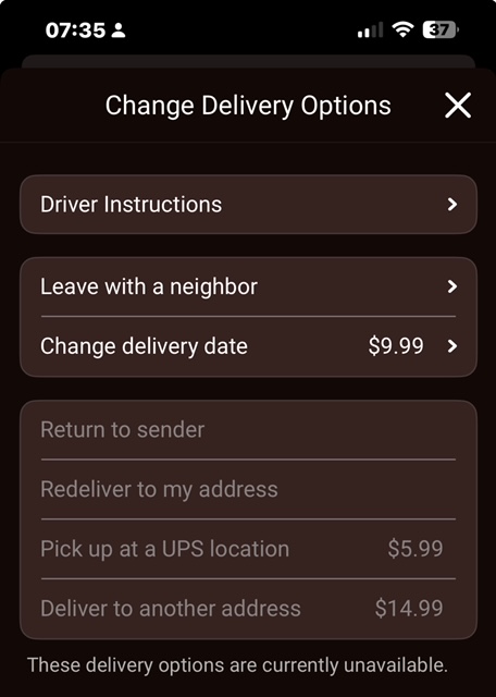 Options may open up as your package is separated from the pallet and scanned to be destined onto it's final flight or truck.None of those options are available for me, even if I’m willing to pay. It shows as available with the charge, but when I tried clicking through it, it says restricted at the very end.