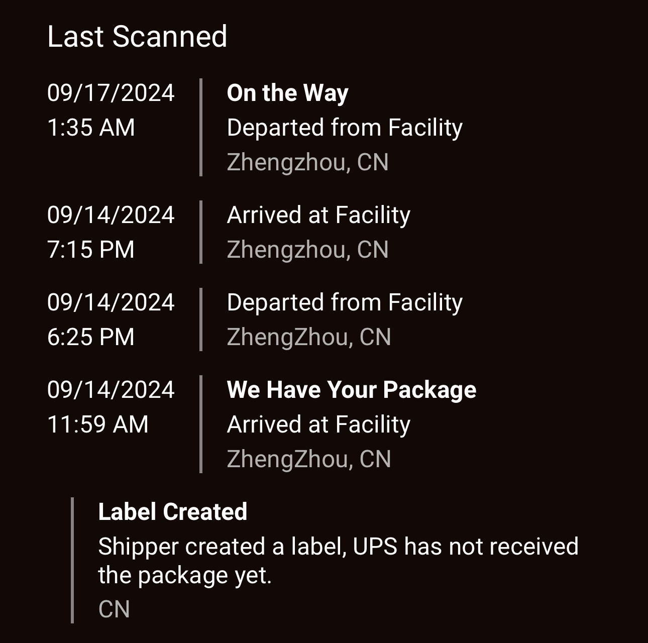 This is what it show so far on UPSYou have to search to find a flight that left your last Departure point from your UPS tracking code scan? You have to match the takeoff time to your last time shown.