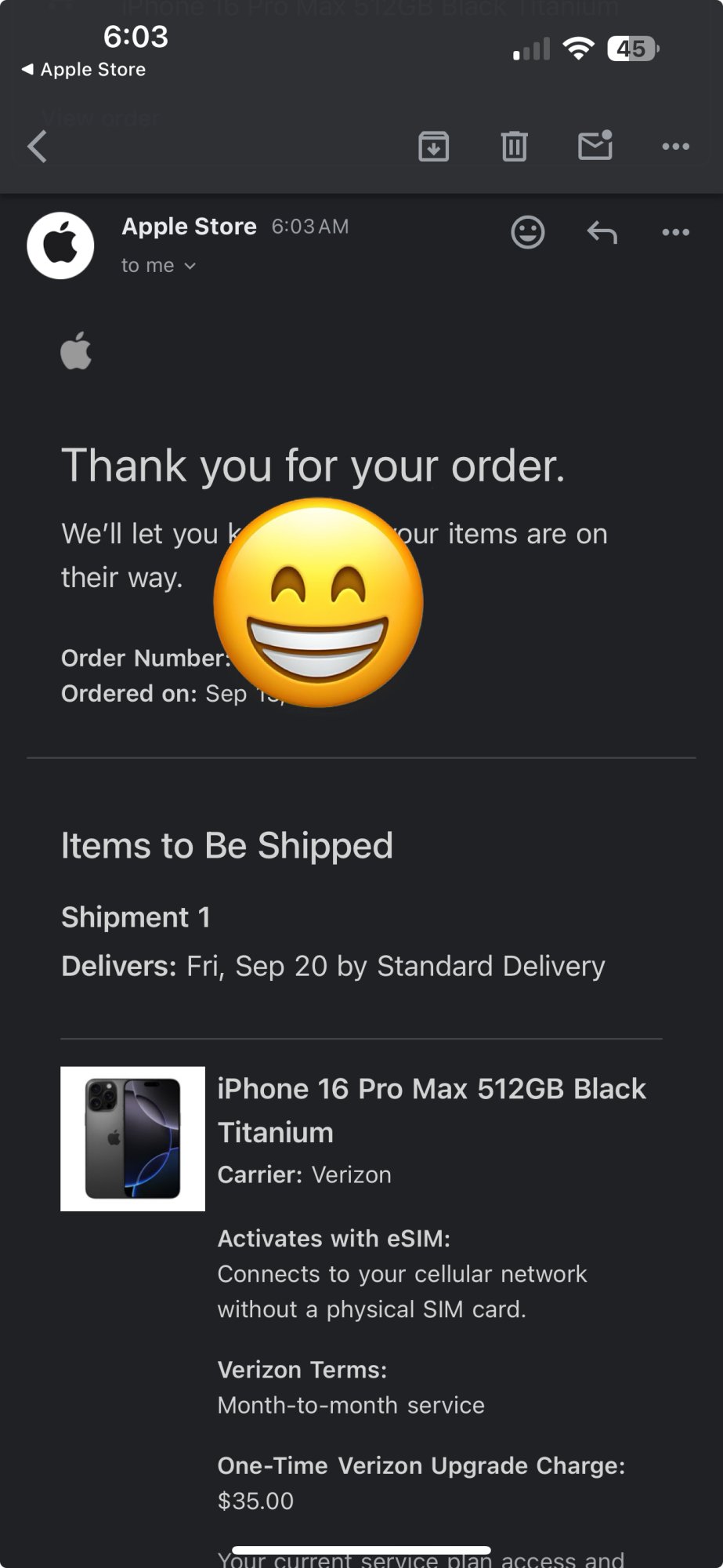 Order placed at 7:02 and delivers on the 20th. 16 PM Natural Titanium 256GB.