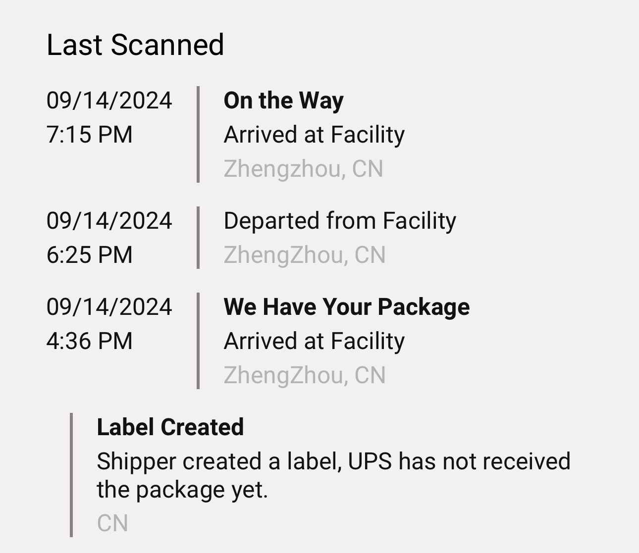 I clicked on it and there was the whole tracking #Now there's that familiar ZhengZhou, CN scan, did you just see that tracking number in UPS MyChoice this morning? I woke up and was hopeful it would be there, but so far not.I don't see it searching by reference number either. If I remember right from years past, I think when you search by reference number it only gives you the last 4 numbers of the tracking number. So that makes it hard to track.